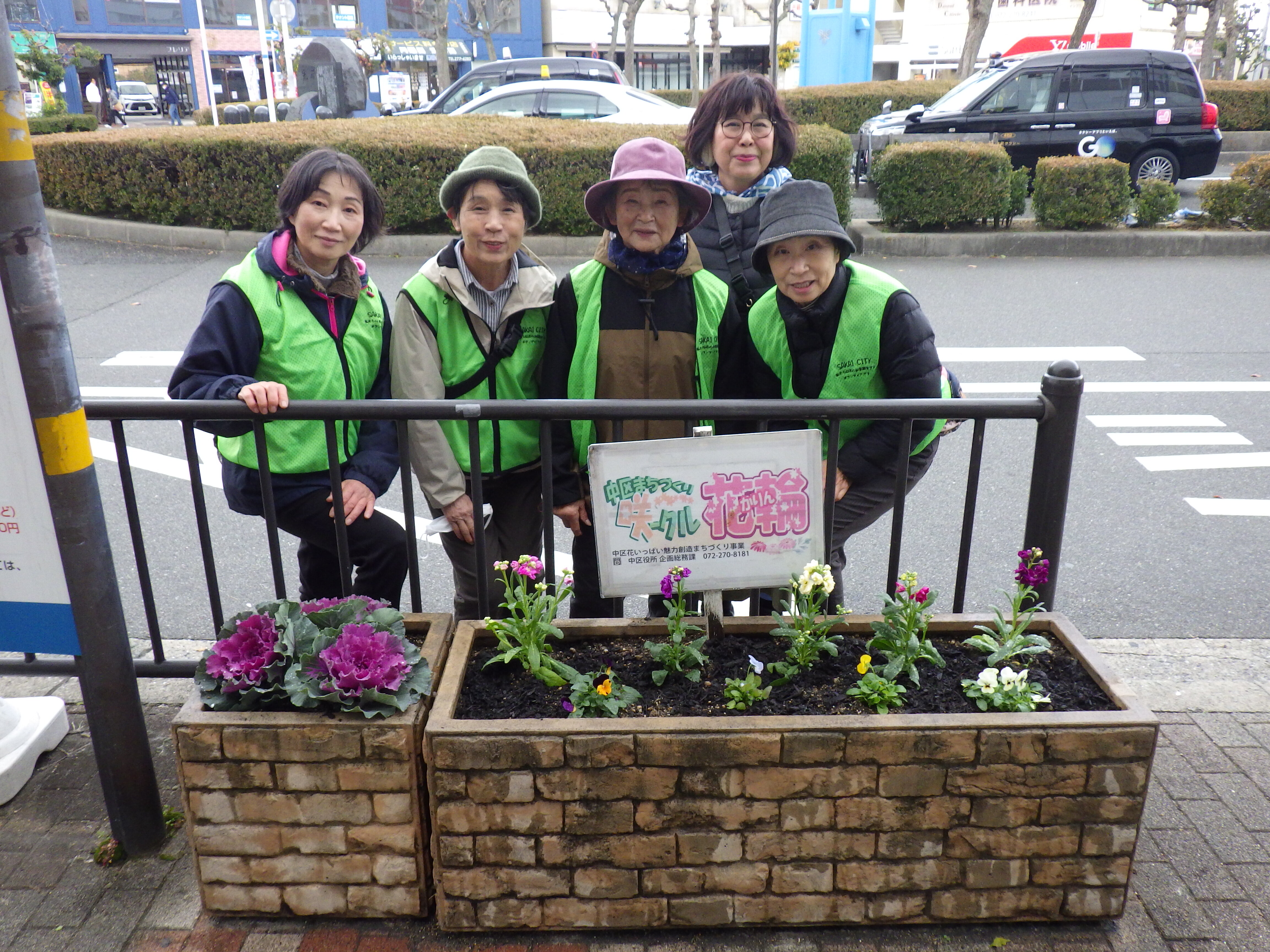 南海泉北線「深井駅前」のフラワーポットを、中区まちづくり咲ークル 「花輪」の皆さまのご協力で花植え活動を行いました。
