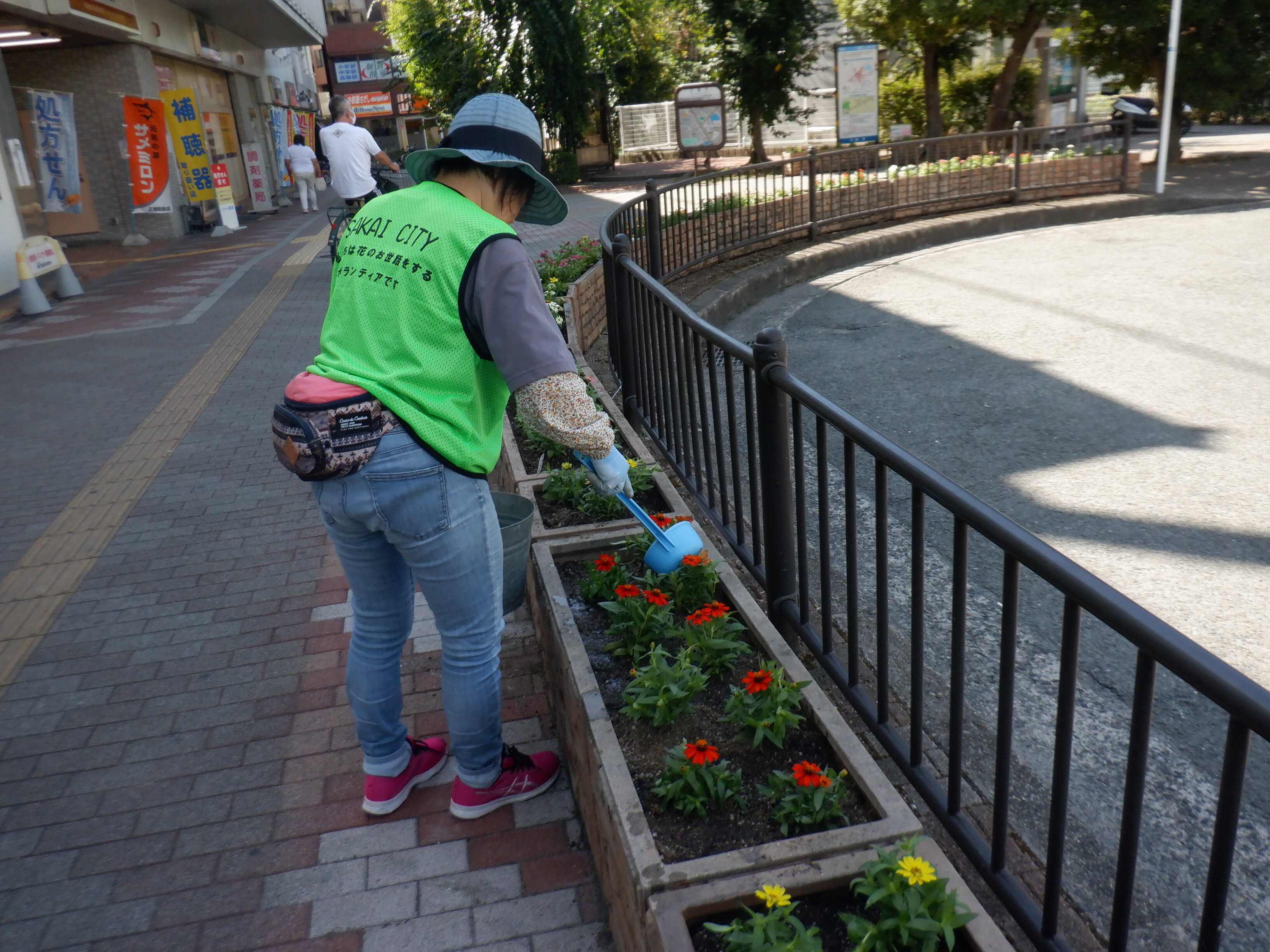 南海泉北線「深井駅前」のフラワーポットを、中区まちづくり咲ークル 「花輪」の皆さまのご協力で花植え活動を行いました。