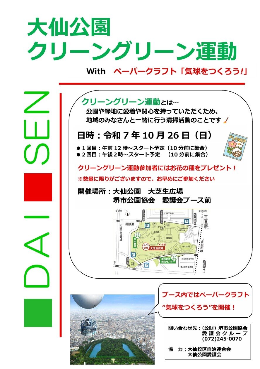 10月26日(日)大仙公園内で行う堺市都市緑化祭にて、「大仙クリーングリーン運動」を開催します!