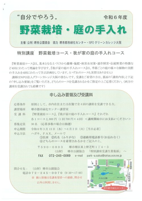 令和6年度、下記日程で「園芸連続講座(入門編・応用編)」「特別講座(野菜栽培コース・我が家の庭の手入れコース)」を開講します。申込み等は下記のチラシをご覧ください。